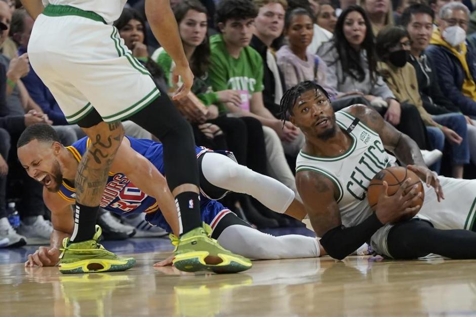 Golden State Warriors guard Stephen Curry, left, can’t quite get the loose ball as Boston Celtics guard Marcus Smart makes the recovery at the Chase Center in San Francisco on Wed Mar 16, 2022 (AP News photo)