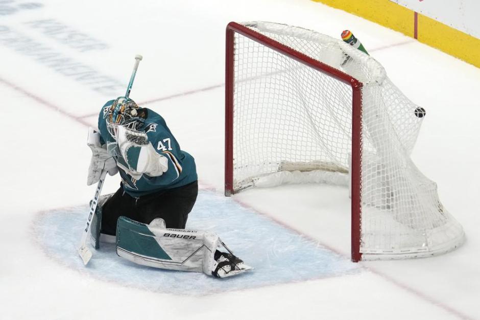 The Florida Panthers Nick Vatrano’s overtime shot finds the back of the net as the San Jose Sharks goaltender James Reimer is caught off guard at the SAP Center in San Jose on Tue Mar 15, 2022 (AP News photo)