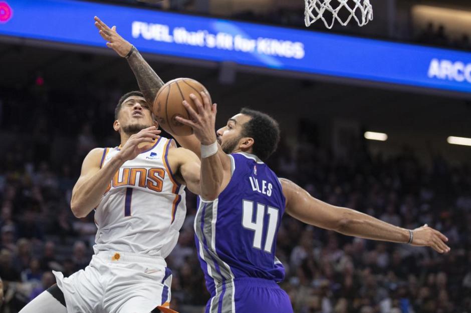 Phoenix Suns guard Devin Booker (1) is fouled by Sacramento Kings forward Trey Lyles (41) in the second half at the Golden One Arena Sacramento on Sun Mar 21, 2022 (AP News photo)