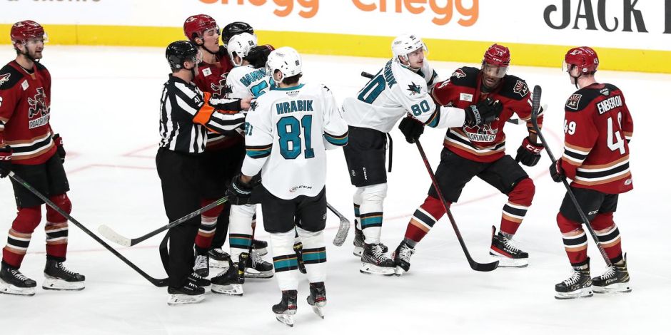 The San Jose Barracuda Steenn Pasichnuk (80) holds back the Tucson Roadrunners Boko Imama (right) after the Barracuda’s Krystof Hrabik (81) made racist ape like gestures towards Imama on Jan 12, 2022. Hrabik was suspeneded for 30 games which was shortened to 28 activated on Wed Mar 30, 2022. The Barracuda will not have him back for the rest of the season and his contract is finished after this season. (file photo by fearofthefin.com)