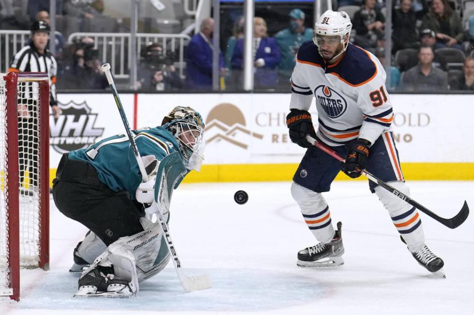 Evander Kane of the Edmonton Oilers (91) tries to get the puck past the San Jose Sharks goaltender James Reimer (47) second period at the SAP Center in San Jose on Tue Apr 5, 2022 (AP News photo)