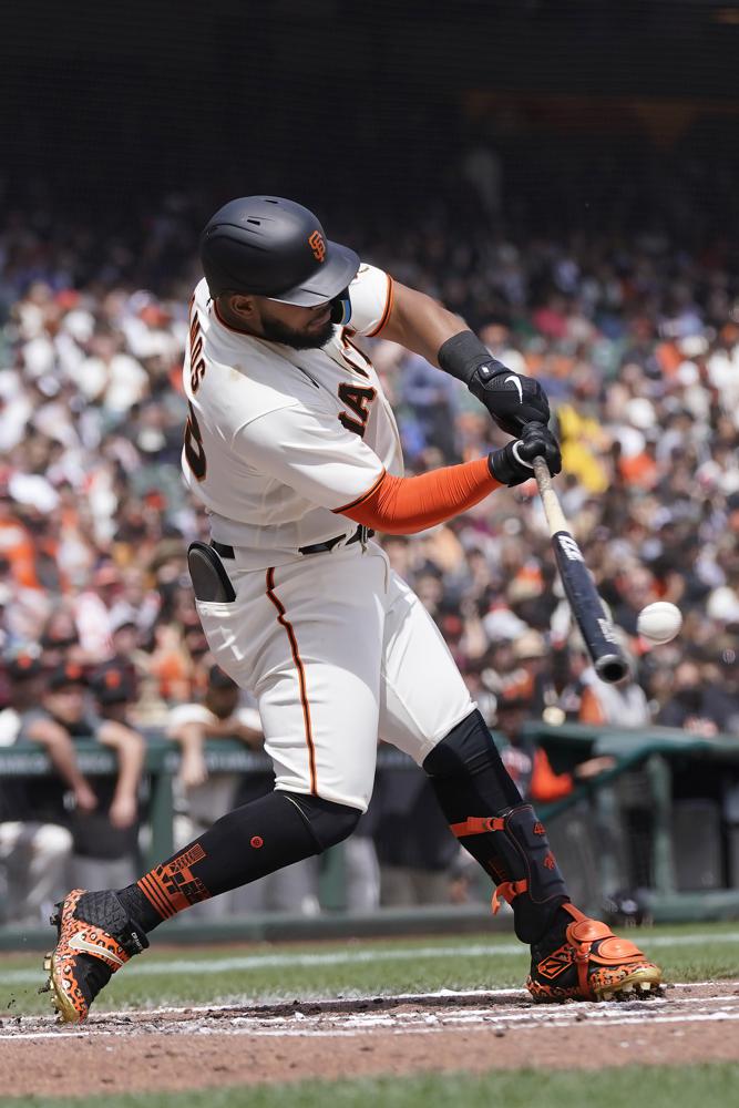 The San Francisco Giants hitter Heliot Ramos swings for a single in the bottom of the second inning at Oracle Park in San Francisco against Miami Marlins pitcher Trevor Rogers on Sun Apr 10, 2022 (AP News photo)