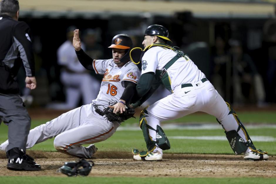 Baltimore Orioles’ Trey Mancini (16) is tagged out at home by Oakland Athletics catcher Sean Murphy, right, on a ball hit by Austin Hays at the Oakland Coliseum on Mon Apr 18, 2022 (AP News photo)