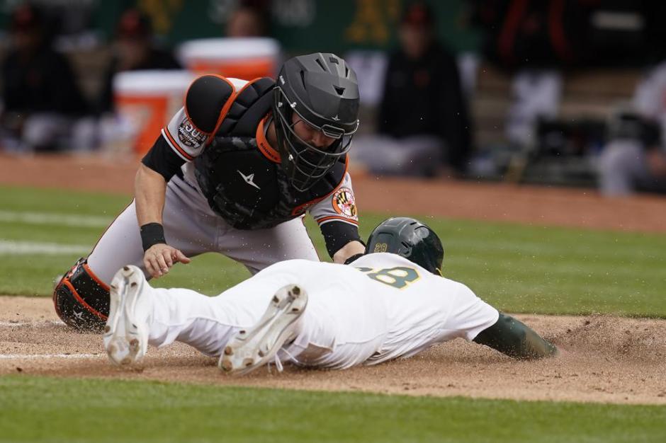 Oakland A’s runner Billy McKinney was originally called safe but the call was overturned on review ruling that Baltimore Orioles catcher Anthony Bemboom just got the tag on McKinney before he touched home plate in the second inning at the Oakland Coliseum on Wed Apr 20, 2022 (AP News photo)
