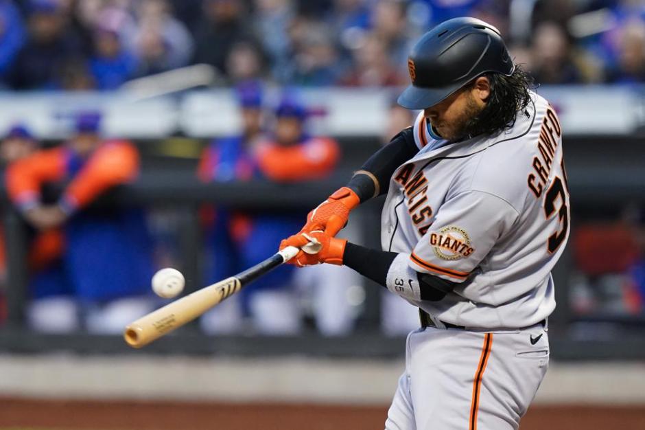 San Francisco Giant shortstop Brandon Crawford singles in the top of the first inning against the New York Mets at Citi Field in Flushing on Wed Apr 20, 2022 (AP News photo)