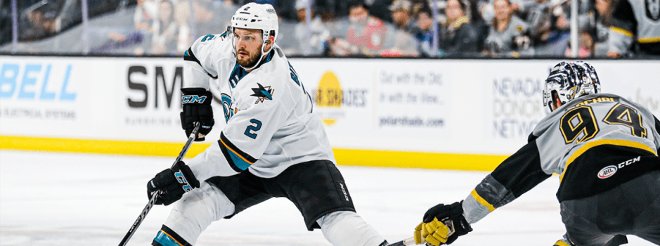 San Jose Barracuda defenseman Anthony Bitetto (2) looks for the puck Henderson Silver Knights defenseman #94 Brayden Pachal (right) at the Dollar Loan Center in Henderson on Fri Apr 22, 2022 (photo from the San Jose Barracuda)
