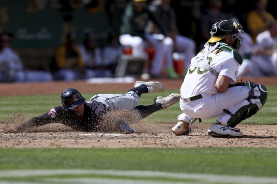 Cleveland Guardians’ Owen Miller, left, scores ahead of the ball as Oakland Athletics catcher Austin Allen, right, waits for the throw after a double hit by Richie Palacios in the top of the ninth inning at the Oakland Coliseum on Sat Apr 30, 2022 (AP News photo)
