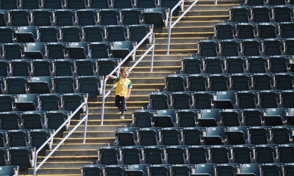 Oakland Coliseum site of the smallest crowd since the 1980 season with one of the smallest customers on the stairs with a whole section to himself the A’s drew 2488 against the Tampa Bay Rays on Mon May 2, 2022 (USA Today photo)