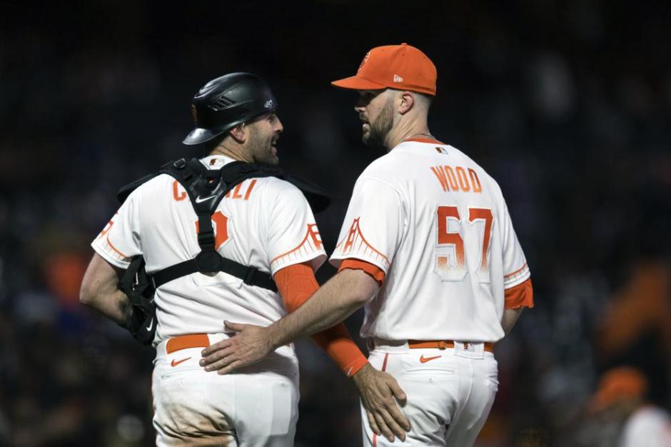The San Francisco Giants catcher Curt Casali (2) and starting pitcher Alex Wood (57) are grateful after a double play that got them out of the top of the fifth inning against the Colorado Rockies at Oracle Park in San Francisco (AP News photo)