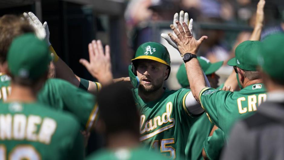 The Oakland A’s Seth Brown (15) who connected for a go ahead two run home run in the top of the eighth inning against the Detroit Tigers at Comerica Park on Thu May 12, 2022 (AP News photo)
