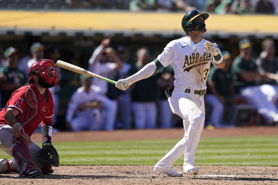 The Oakland A’s Luis Barrera connects for a right field walk off home run in the bottom of the ninth inning against the Los Angeles Angels in the front game of a doubleheader at the Oakland Coliseum on Sat May 14, 2022 (AP News photo)