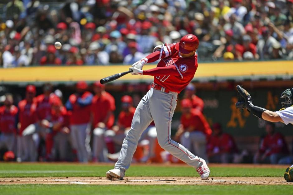 Los Angeles Angels designated hitter Shohei Ohtani gets around on a Oakland A’s starter Frankie Montas top of the first inning pitch for a home run at the Oakland Coliseum on Sun May 15, 2022
