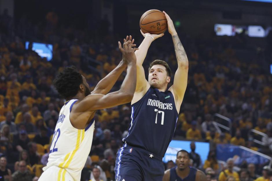 The Dallas Mavericks guard Luka Doncic (11) takes a shot against the Golden State Warriors forward Andrew Wiggins (22) in the first half of action at the Chase Center in San Francisco in game 2 of the NBA Western Conference Finals on Fri May 20, 2022 (AP News photo)