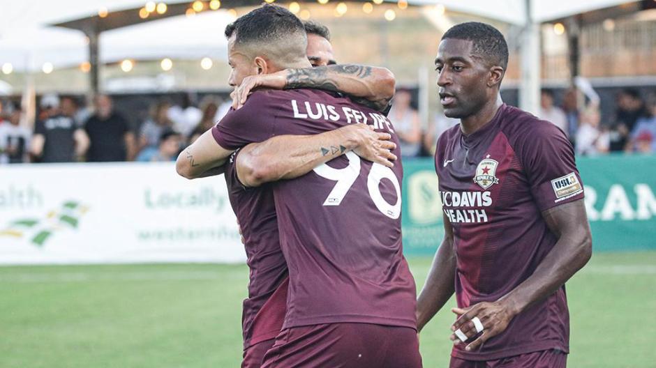 Luis Felipe (#96) celebrates his goal he scored in the 28th minute with his teammates on Wednesday evening at Heart Health Park. May 25, 2022. (Courtesy of Sacramento Republic FC)