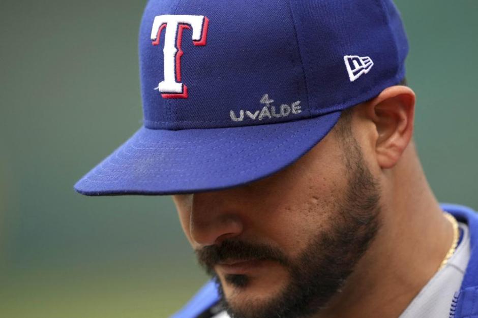 Texas Rangers pitcher Martin Perez walks to the Rangers dugout on the first base side before the ball game on Thu May 26, 2022 at the Oakland Coliseum with the inscription on his hat dedicated to the Robb Elementary School shooting victims in Uvlade Texas (AP News photo)
