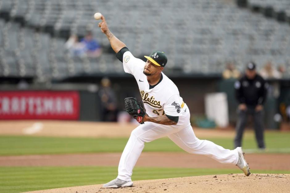Oakland A’s starter Frankie Montas gave it his all pitching seven innings, here Montas is throwing against the Texas Rangers line up on Thu May 26, 2022 at the Oakland Coliseum (AP News photo)