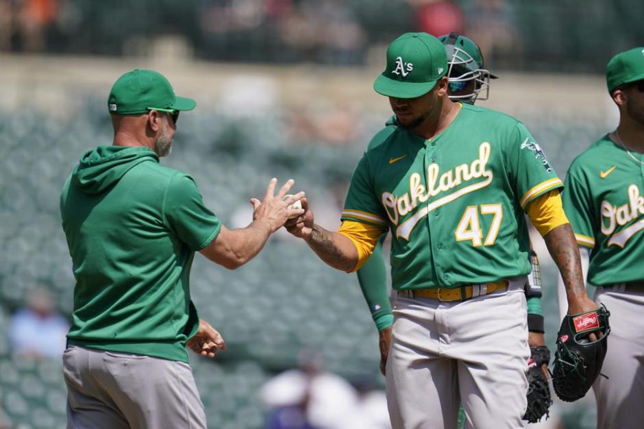 Oakland A’s pitcher Frankie Montas gives up the ball to manager Mark Kotsay in the bottom of the seventh on Tue May 10, 2022 at Tiger Stadium in Detroit. Montas gets the start tonight against