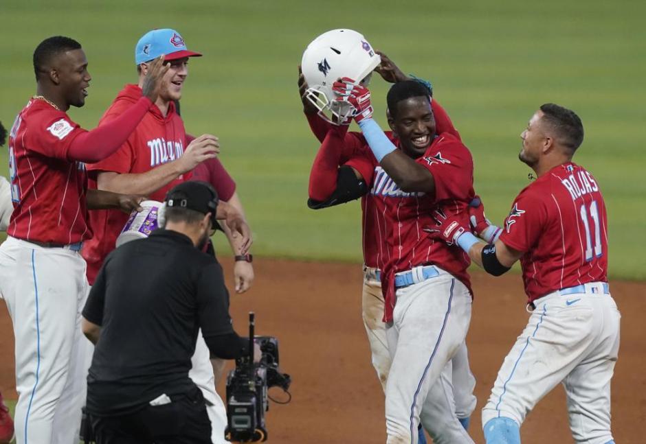 The Miami Marlins football helmet is like a trophy for the gamer as Jesus Sanchez’ sac fly scores the game winning run in the bottom of the ninth to defeat the San Francisco Giants at DepotLoan Park in Miami (AP News photo)