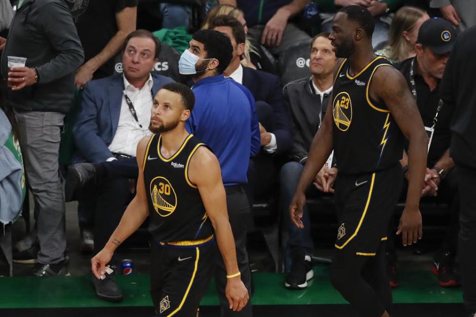 Golden State Warriors guard Stephen Curry (30), forward Draymond Green (23), and owner Joe Lacob in blue sport jacket seated in the front row all look disappointed after looking at the scoreboard in the third quarter against the Boston Celtics at TD Garden in Boston on Wed Jun 8, 2022 (AP News photo)