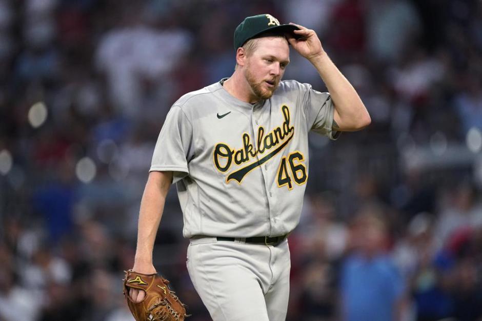 The Oakland A’s Jared Koenig moves his cap around after being lifted in the bottom of the fifth inning against the Atlanta Braves on Wed Jun 9, 2022 at Truist Field in Atlanta (AP News photo)