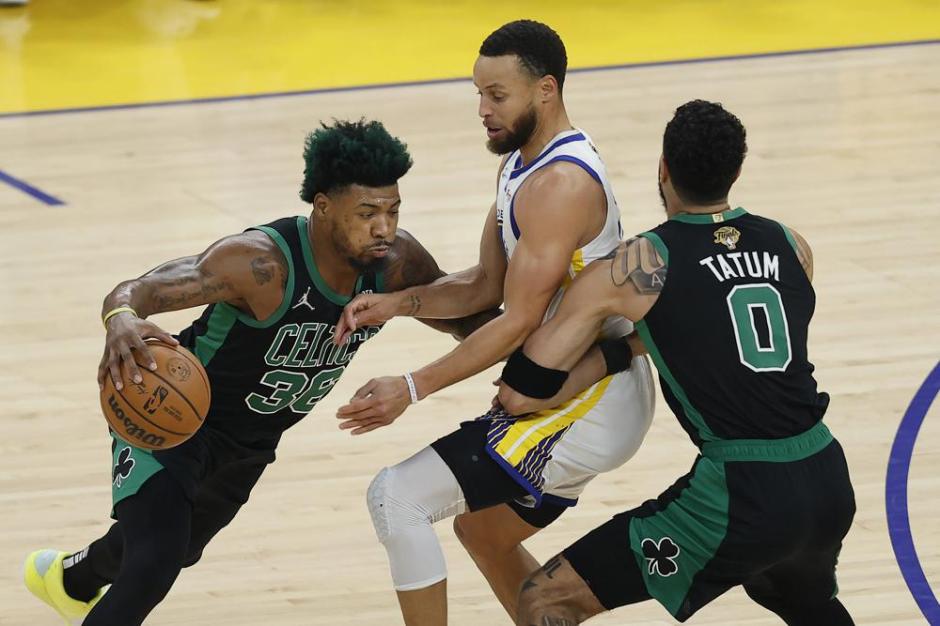 Boston Celtics guard Marcus Smart (36) drives around the Golden State Warriors guard Stephen Curry (30) as the Celtics forward Jaylen Brown (0) puts on a block during first half action at the Chase Center in San Francisco on Mon Jun 13, 2022 (AP News photo)