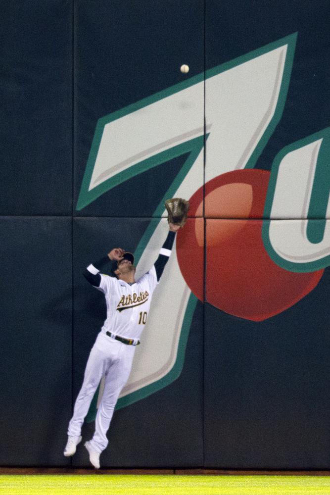Oakland Athletics left fielder Chad Pinder gets in the left field corner to make a brilliant catch on a ball hit by Kansas City Royals’ Bobby Witt Jr. in the top of the six inning at the Oakland Coliseum on Friday, June 17, 2022 (AP News photo)
