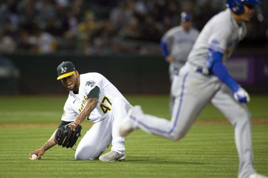 Oakland A’s pitcher Frankie Montas bare hands a grounder in the top of the fifth inning as the Kansas City Royals Mike Lopez tries to run it out at the Oakland Coliseum on Fri Jun 17, 2022