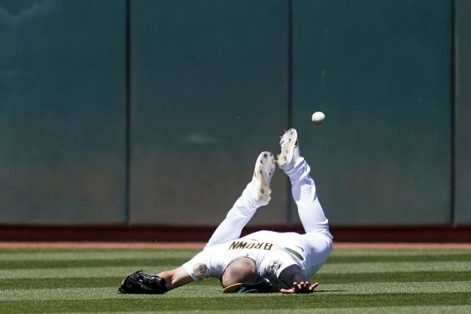 Oakland A’s left fielder Seth Brown literally leaves it all on the field and can’t catch the Kansas City Royals Michael A Taylor’s drive which turned into a triple in the top of the seventh inning at the Oakland Coliseum on Sat Jun 18, 2022 (AP News photo)