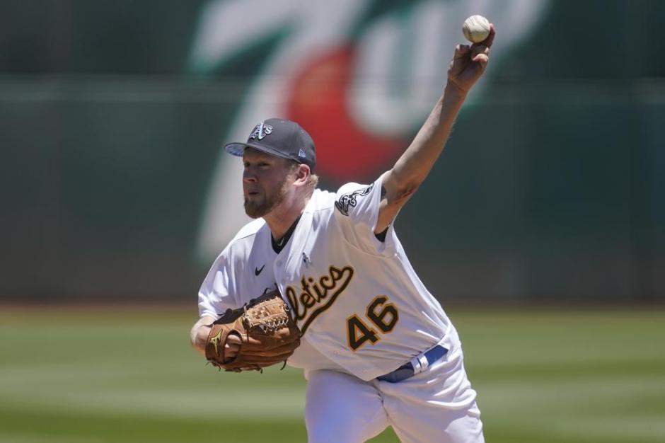 Oakland A’s starter Jared Koenig fires against the Kansas City Royals line up in first inning action at the Oakland Coliseum on Sun Jun 19, 2022 (AP News photo)