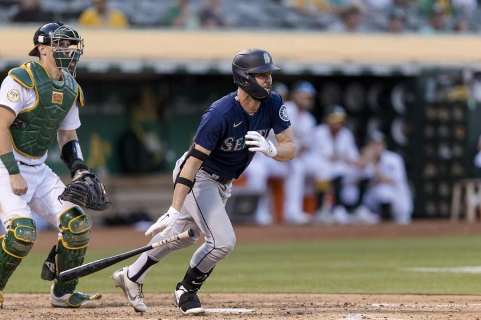 Seattle Mariners’ Jesse Winker, right, smashes an RBI double in front of Oakland Athletics catcher Sean Murphy (12) in the top of the sixth inning at the Oakland Coliseum Tue, Jun 21, 2022. (AP News photo)