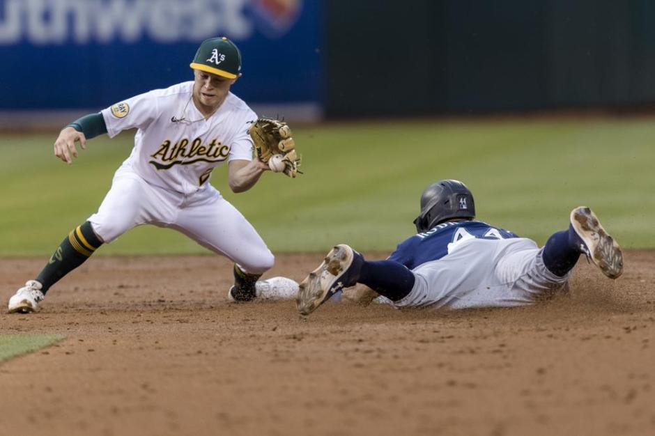Oakland A’s shortstop Nick Allen (left) gets the ball too late as the Seattle Mariners Julio Rodriguez (right) slides in safely at second base in the top of the third inning at the Oakland Coliseum on Wed Jun 22, 2022 (AP News photo)
