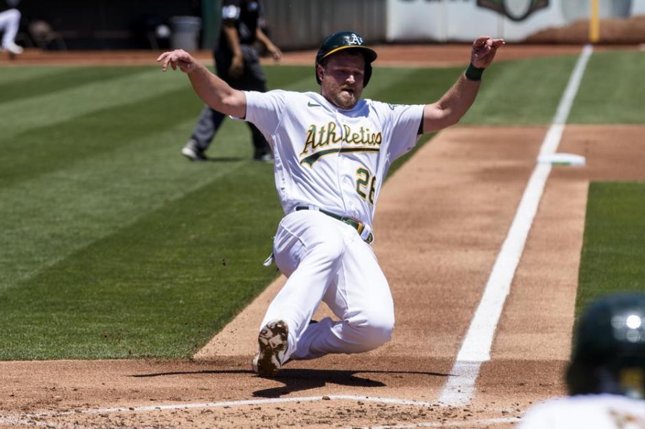The Oakland A’s Sheldon Neuse slides in at home plate in the bottom of the first inning to score the A’s only run of the game against the Seattle Mariners at the Oakland Coliseum on Thu Jun 23, 2022 (AP News photo)