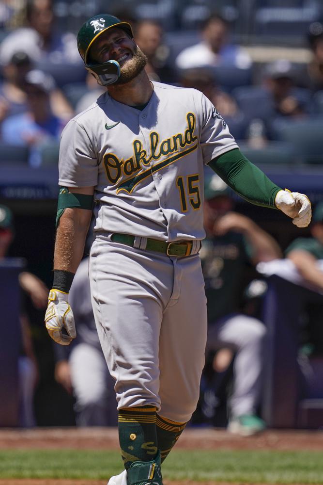 The Oakland A’s Seth Brown grimaces after getting hit with a New York Yankee pitch in the top of the second inning at Yankee Stadium in the Bronx on Wed Jun 29, 2022 (AP News photo)