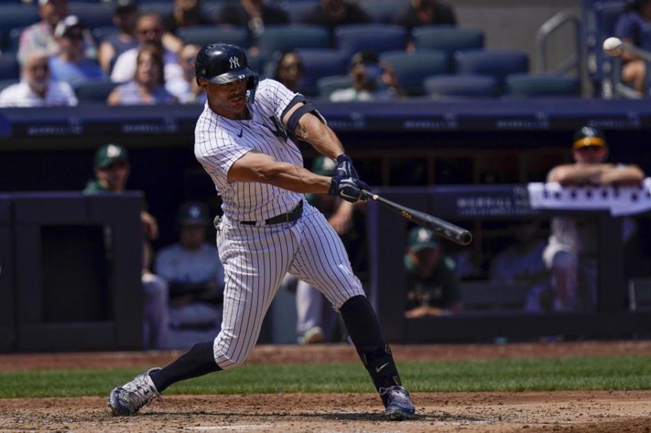 New York Yankees slugger Giancarlo Stanton takes a cut in the bottom of the third inning for a home run against the Oakland A’s at Yankee Stadium in the Bronx on Wed Jun 29, 2022 (AP News photo)