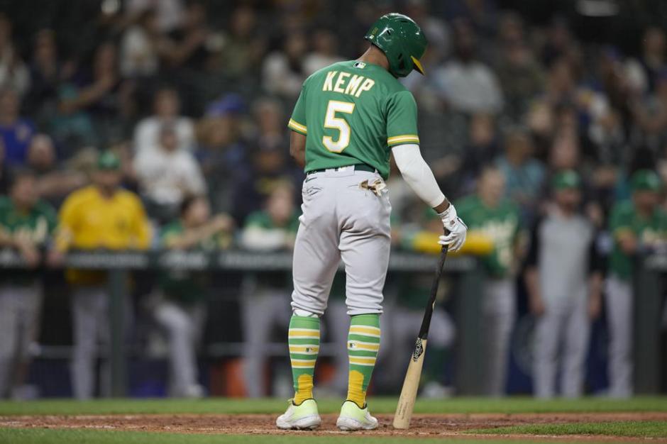 Oakland A’s hitter Tony Kemp takes strike three in the top of the ninth inning at T Mobile Field in Seattle against the Seattle Mariners on Thu Jun 30, 2022 (AP News photo)