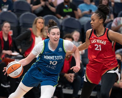 Minnesota Lynx forward Jessica Shepard (10) dribbles the ball against Las Vegas Aces center Iliana Rupert (21) (photo from the Minnesota Star Tribune Erica Dischino)