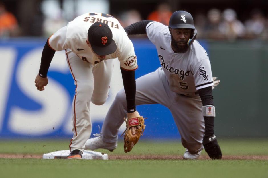 Chicago White Sox’s Josh Harrison, right, gets into second base as San Francisco Giants second baseman Wilmer Flores reaches for the thrown ball for an error on Sunday, July 3, 2022, at Oracle Park in San Francisco (AP News photo)