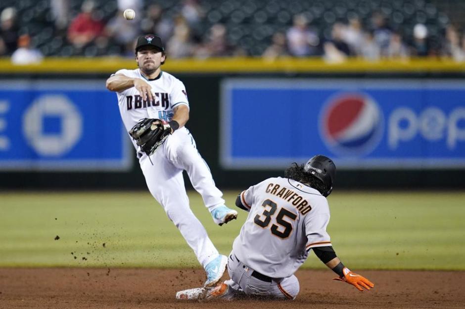 The Arizona Diamondbacks second baseman Buddy Kennedy retires San Francisco Giant Brandon Crawford at second and relays the throw to first in a double play in the top of the third inning at Chase Field in Phoenix on Tue Jul 5, 2022 (AP News photo)