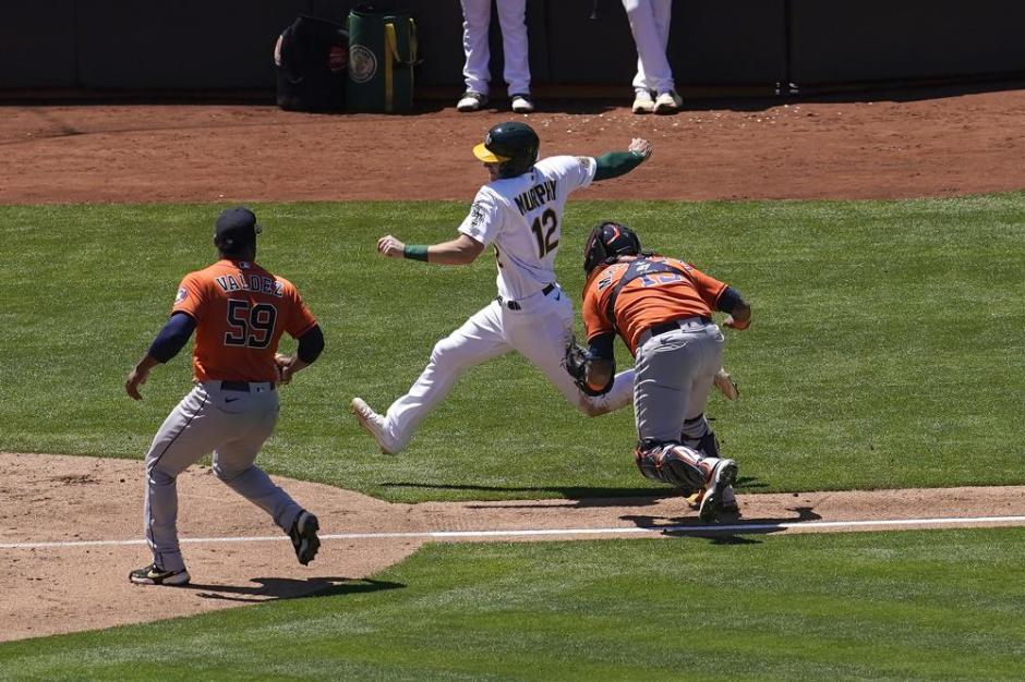 Oakland Athletics’ Sean Murphy (12) scores on Houston Astros catcher Martin Maldonado, right, and pitcher Framber Valdez (59) in the top of the fourth inning at the Oakland Coliseum Sun Jul 9, 2022 (AP News photo)