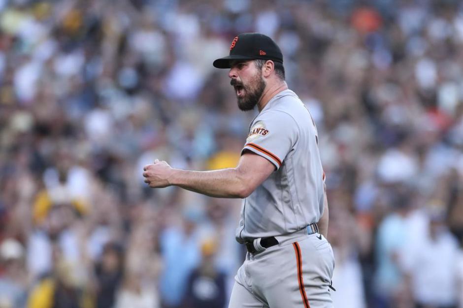 San Francisco Giants starter Carlos Rodon expresses his excitement after getting the win over the San Diego Padres at Petco Park in San Diego on Sat Jul 9, 2022 (AP News photo)