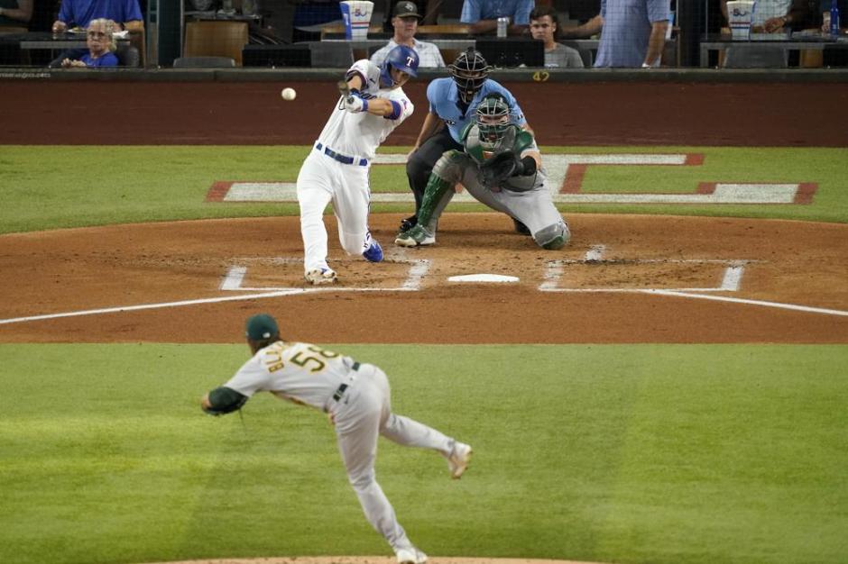 Texas Rangers’ Corey Seager slugs an RBI single off Oakland Athletics starting pitcher Paul Blackburn (58) as catcher Sean Murphy and umpire Johbn Tumpane look on in the first inning, at Globe Life Stadium in Arlington, Texas on Wed Jul 13, 2022. (AP News photo)