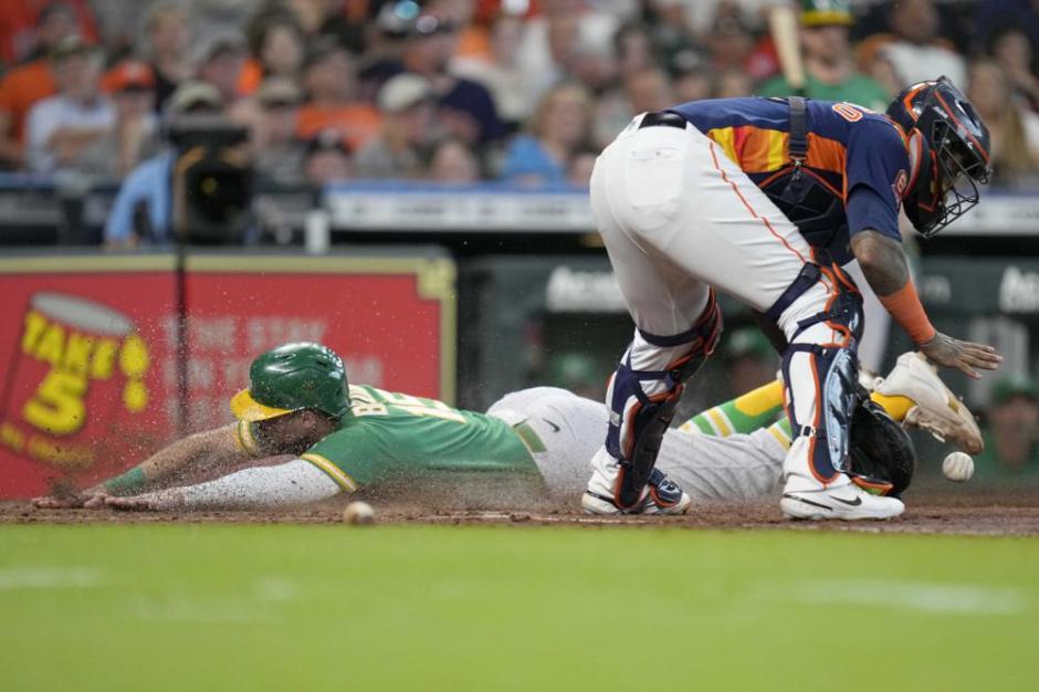Oakland Athletics’ Seth Brown, bottom left, slides safely past Houston Astros catcher Martin Maldonado to score on Stephen Vogt’s sacrifice fly during the sixth inning of a baseball game, Sunday, July 17, 2022, in Houston. (AP News photo)