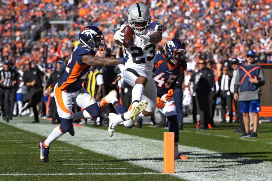 Las Vegas Raiders running back Kenyan Drake scores a touchdown as Denver Broncos cornerback Kyle Fuller (23) and inside linebacker A.J. Johnson (45) defend during the first half of an NFL football game, Sunday, Oct. 17, 2021, in Denver. Drake is trying to return from an ankle surgery he had in December and try and make the team this month in Raiders camp. (AP News file photo)