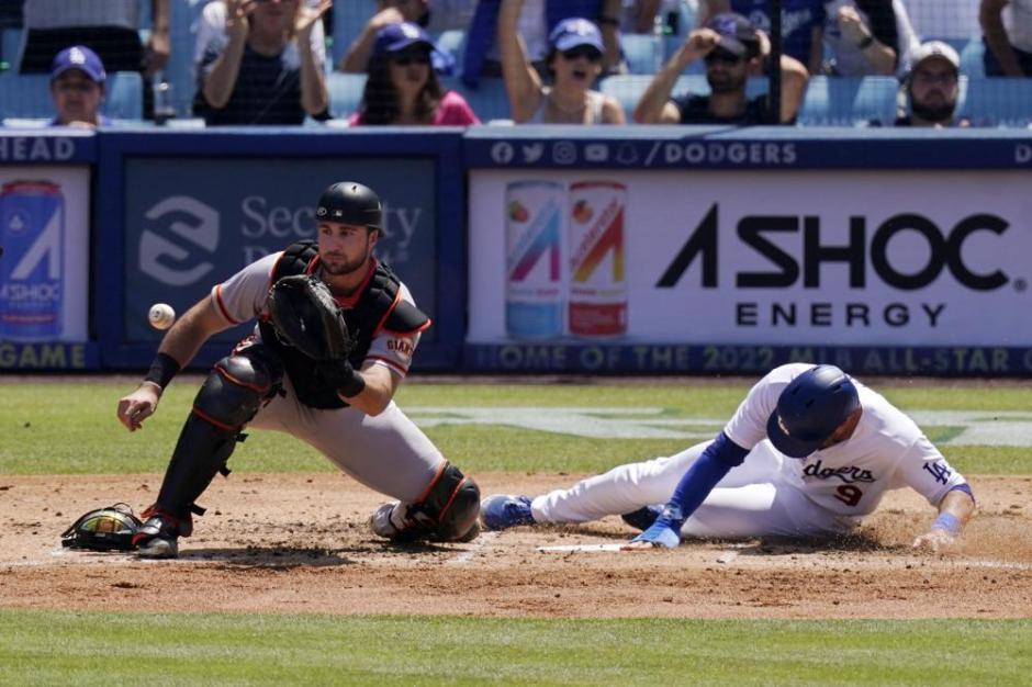 The Los Angeles Dodgers Gavin Lux slides in safely ahead of the throw as the San Francisco Giants catcher Joey Bart waits for the ball in the bottom of the third inning at Dodgers Stadium in Los Angeles (AP News photo)