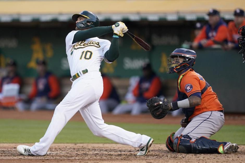 Oakland A’s first baseman Chad Pinder connects for a grand slam home run in the bottom of the the third inning against the Houston Astros at the Oakland Coliseum on Tue Jul 26, 2022 (AP News photo)