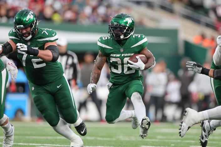 Former New York Jet running back Austin Walker (38) will carry for the Las Vegas Raiders this season his fourth season in the NFL (photo from yahoo.com sports)