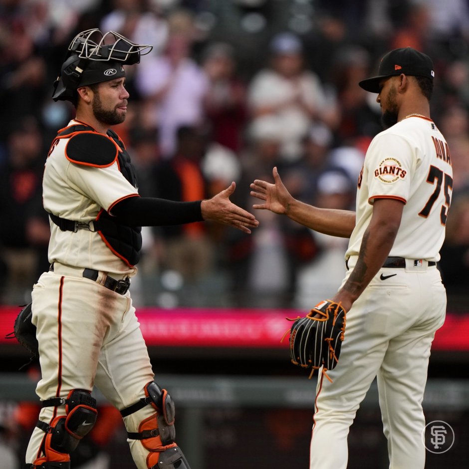 San Francisco Giants catcher Austin Wynns (16) congratulates closer Camilo Doval (75) after their contest against the visiting Chicago Cubs at Oracle Park in San Francisco on Sun Jul 31, 2022 (@SFGiants photo)