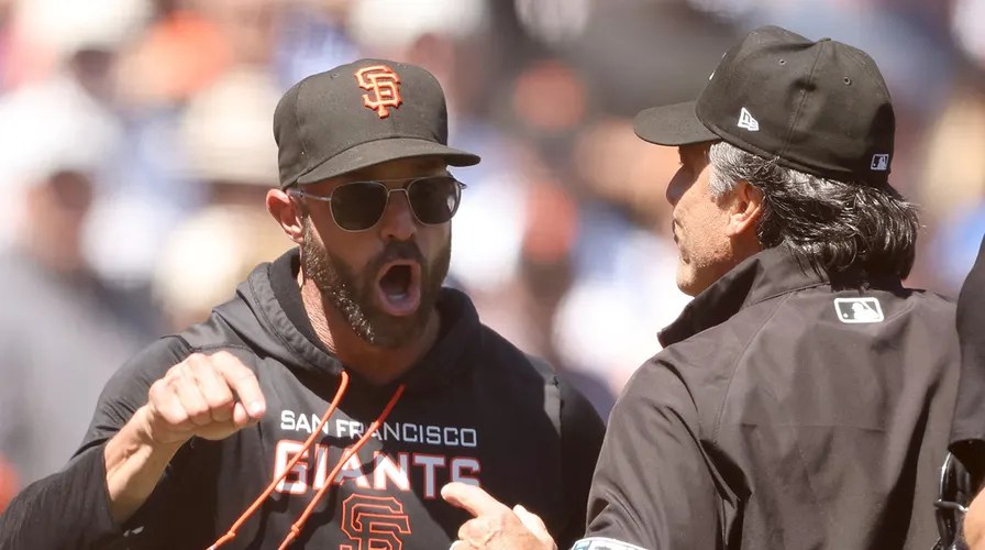 San Francisco Giants manager Gabe Kapler argued with umpire Phil Cuzzi regarding pitcher Jarlin Garcia getting ejected during Thu Aug 4, 2022 game against the Los Angeles Dodgers at Oracle Park in San Francisco (photo from Fox Sports)
