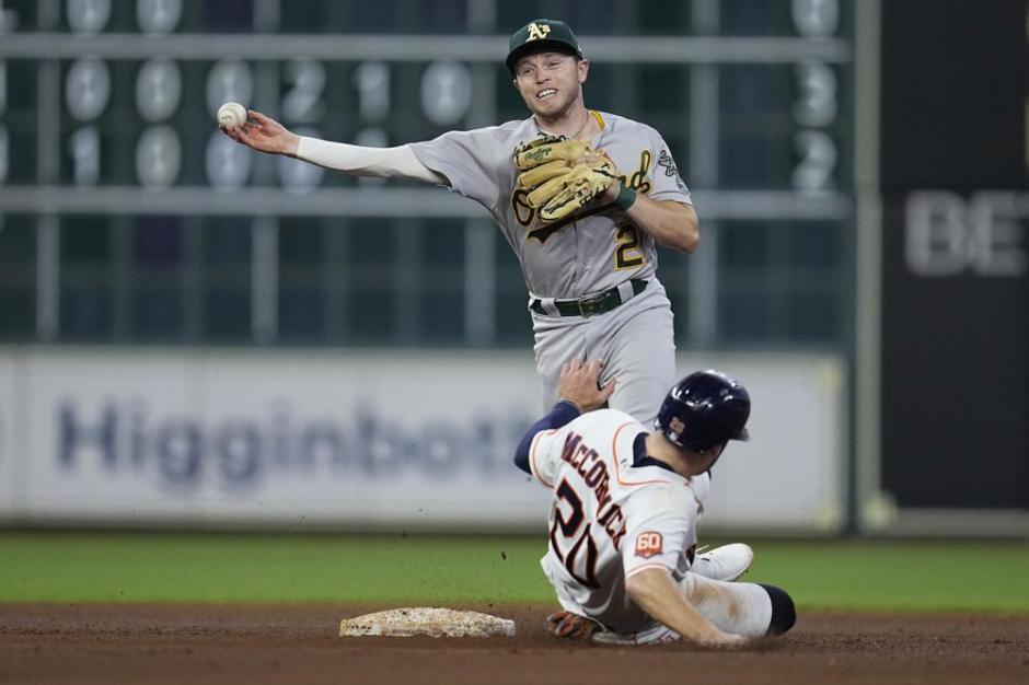 Oakland A’s second baseman Nick Allen turns a double play retiring the sliding Chas McCormick at second base in the bottom of the sixth inning at Minute Maid Field in Houston on Sat Aug 13, 2022 (AP News photo)