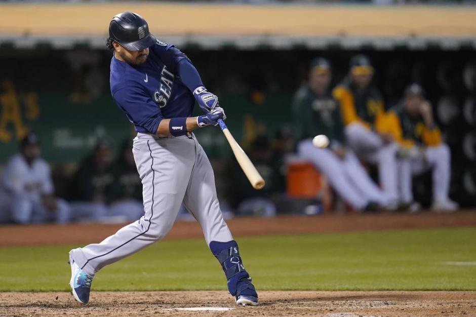 Eugenio Suarez of the Seattle Mariners hits one of his two home runs against the Oakland A’s at the Coliseum this one coming in the top of the sixth on Fri Aug 19, 2022 (AP News photo)